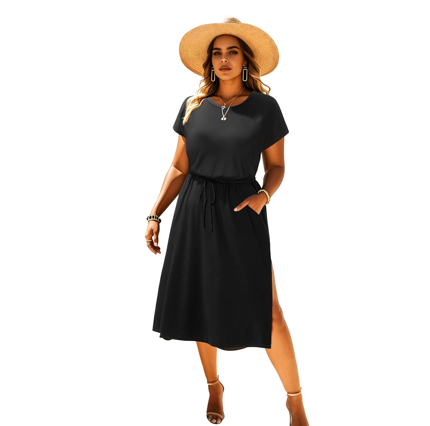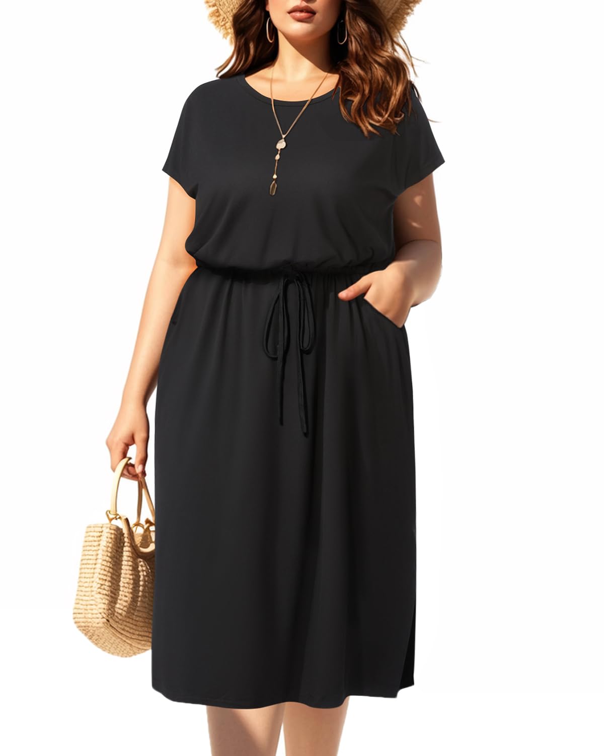 Plus Size Women’s Summer Midi Dress – Short Sleeve, Tie Waist, Pockets, Belly-Hiding Casual Work & Funeral Dress