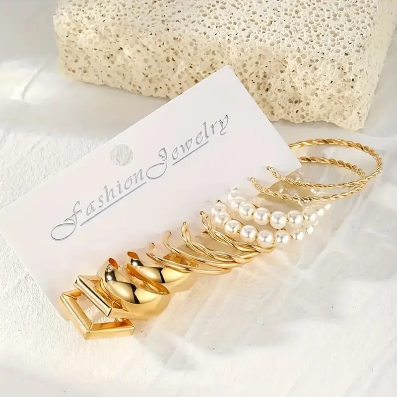 Complete your jewelry collection with this elegant 6-pair golden earring set. Featuring C-shaped geometric hoops, retro twisted designs, and artificial pearl accents, these earrings bring a perfect mix of modern chic and timeless elegance. Ideal for both casual and formal occasions, this set makes a beautiful gift for women who love versatile jewelry.