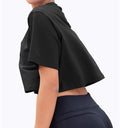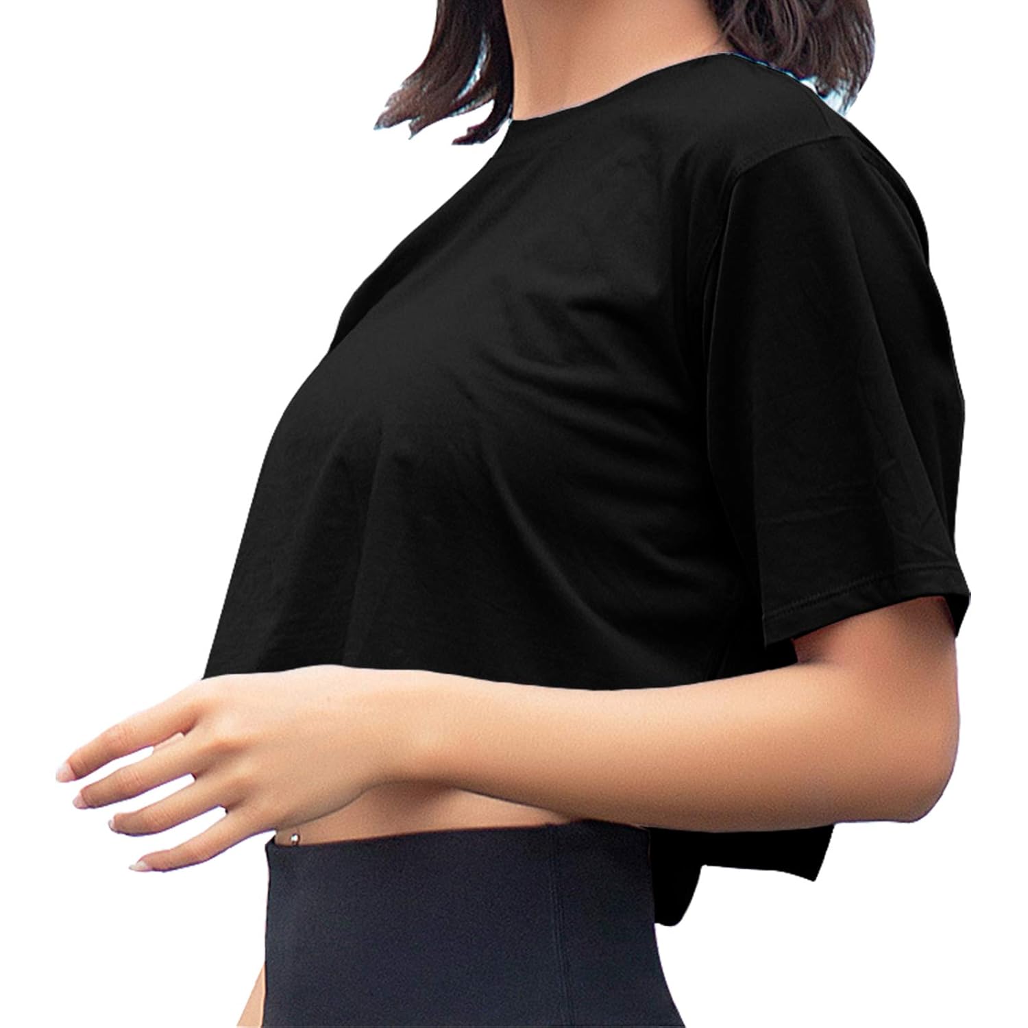 Whether you’re hitting the gym, running errands, or just chilling with friends, this crop top is a go-to piece for effortless style. The classic crew neckline and short sleeves provide a flattering yet relaxed silhouette that complements any outfit. Its cropped length adds a trendy touch, ideal for pairing with high-waisted leggings, shorts, or jeans.