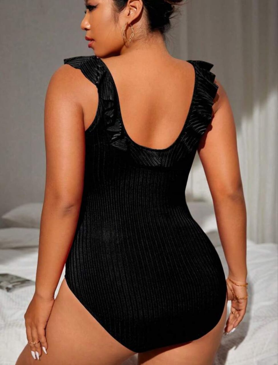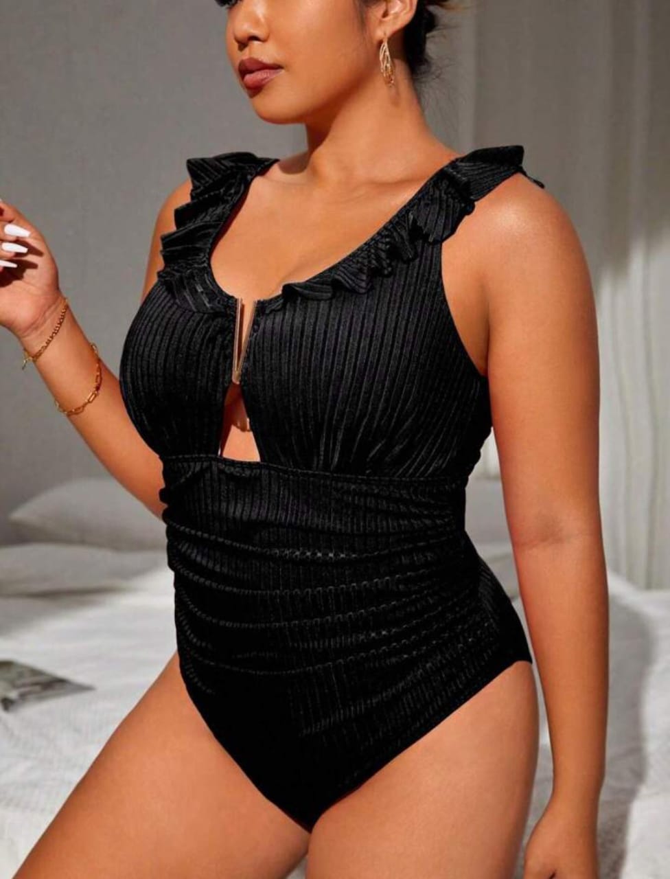 Crafted with a ribbed texture and soft stretch fabric, this swimsuit features a V-neckline with a metal insert and feminine ruffle accents on the shoulder straps. The high-waisted fit helps enhance curves while offering tummy control for a confident beach or pool look.
