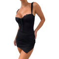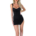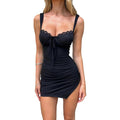 Features: Sleeveless lace casual dress, elegant bodycon dress, sexy low-cut mini dress, lace camisole dress, lined, high side slit, bowknot bust, underwire bust, lace bust detail