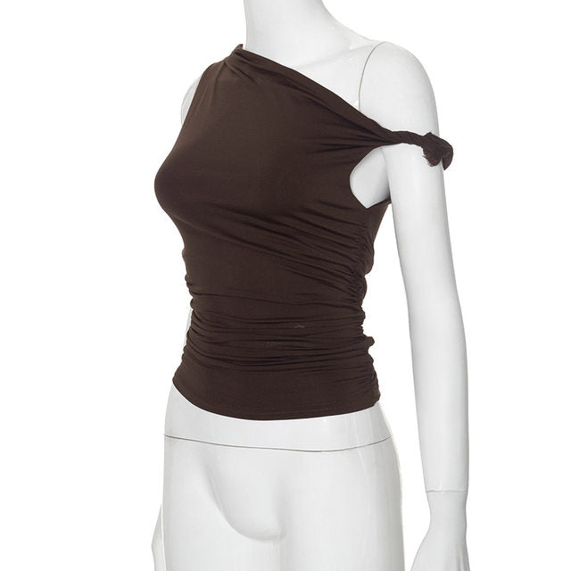 Women's Summer Casual Sleeveless Solid Color Off Shoulder Side Pleated T-Shirt